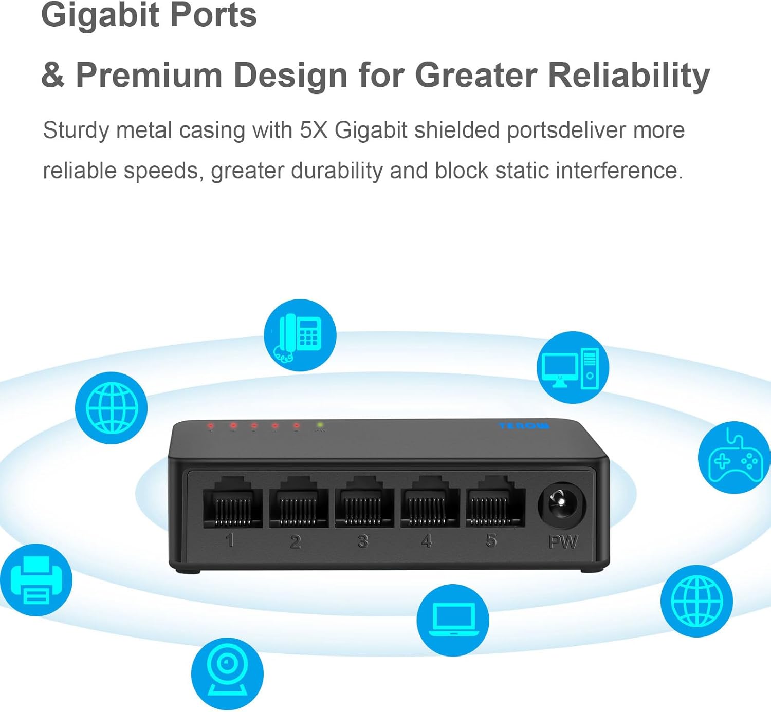 Gigabit Ethernet Switch: Greatly expand network capacity, Terow Gigabit Switch is Configured with 5 Gigabit RJ45 Ports, with auto-negotiation function and Auto MDI/MDIX, Each Port Can up to 1,000Mbs.