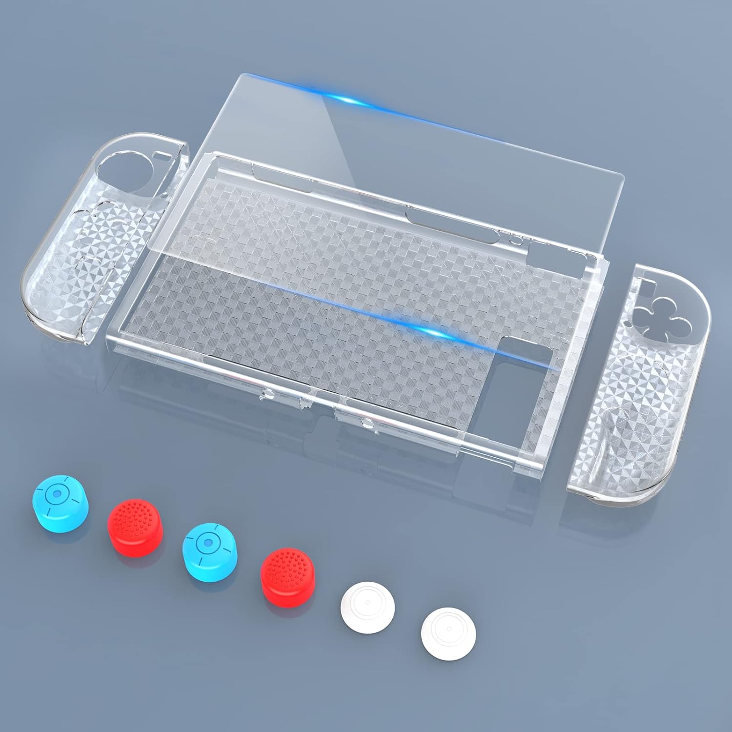 This product includes:1 x Nintendo Switch clear case cover, 1 x Tempered Glass Screen Protector, 6 x Thumb Stick Caps.