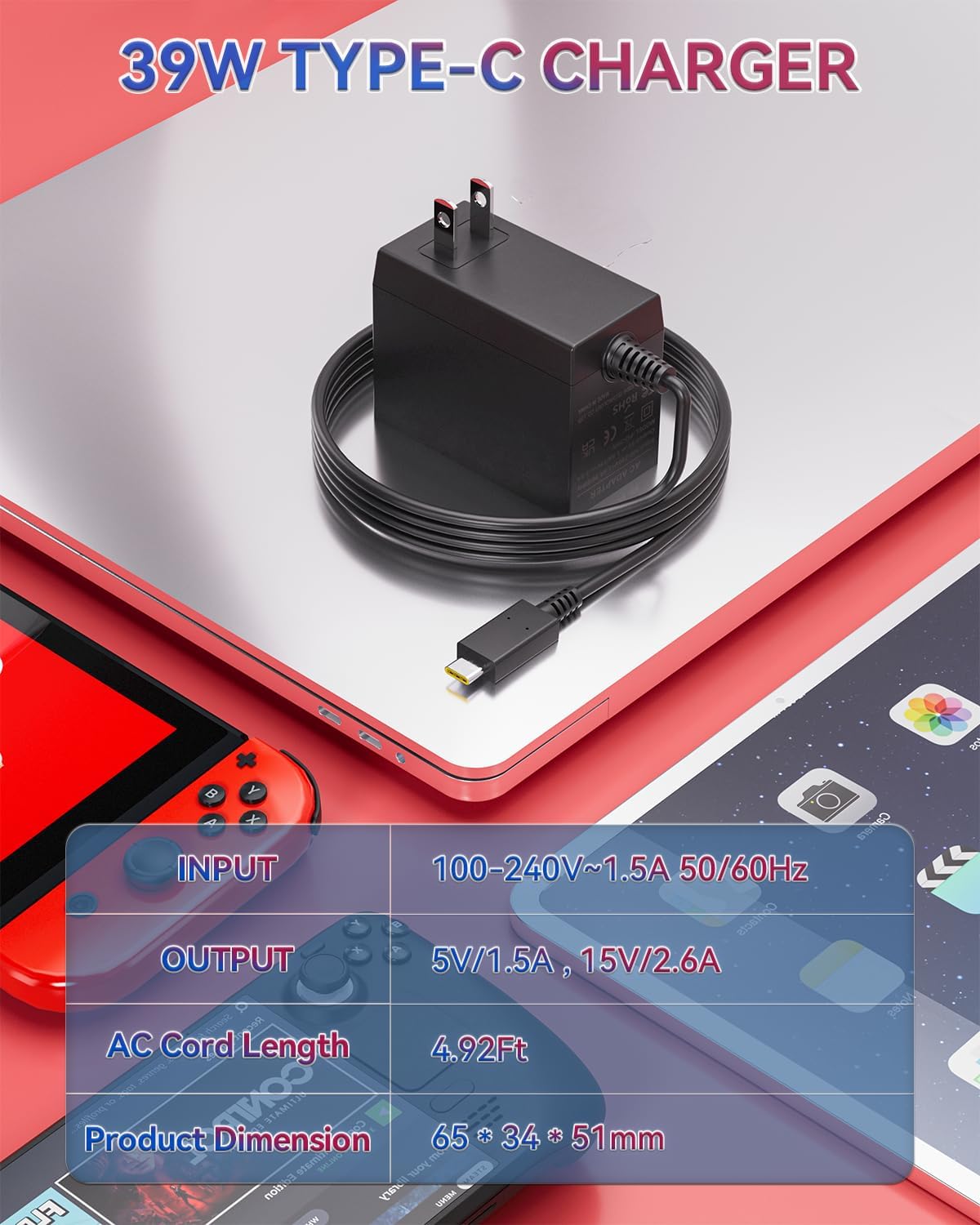Specification : Input Volt Range: AC 100-240V 50-60Hz, Output: 5.0V 3A/15.0V 2.6A, Connector type: USB Type-C, Cable length: 5 Feet;What You Get: Package include: 1 x 39W USB C Switch Charger.